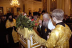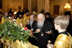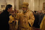 23 февраля делегация Русской Зарубежной Церкви, сопровождающая Высокопреосвященнейшего Митрополита Лавра, молилась в московском Даниловом монастыре за всенощным бдением. Здесь тепло приняли делегацию архимандрит Алексий, наместник монастыря, с братией этой святой обители. Интересно отметить, что Г.Л. Сафонов, регент праздничного хора Данилова монастыря, неоднократно принимал участие в церковно-певческих съездах, устраиваемых Русской Зарубежной Церковью в Северной Америке и Австралии. Во время чтения кафизм Георгий Львович принял благословение у Первоиерарха и других Преосвященных архипастырей Русской Зарубежной Церкви. На воскресный полиелей, чтение Евангелия и помазание елеем верующих вышел епископ Манхэттенский Гавриил, которому сослужили братия монастыря и члены делегации в священном сане. Ниже предлагаем вниманию посетителей интернет-сайта Русской Зарубежной Церкви снимки этого торжественного богослужения.