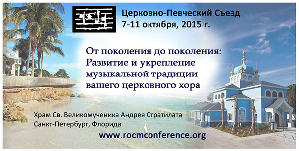 Церковно-Музыкальная комиссия при Архиерейском Синоде сообщает о том, что XXIV церковно-певческий съезд состоится 7-11 октября с.г. в Санкт-Петербурге (Флорида) при храме мученика Андрея Стратилата. Тема съезда - От поколения до поколения: развитие и укрепление музыкальной традиции вашего церковного хора.