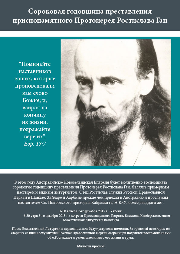 8 декабря в Покровской церкви в Кабраматта отмечают 40-летие кончины протоиерея Ростислава Ган, основавшего большой златоглавый храм в честь Покрова Пресвятой Богородицы в этом районе Сиднея.