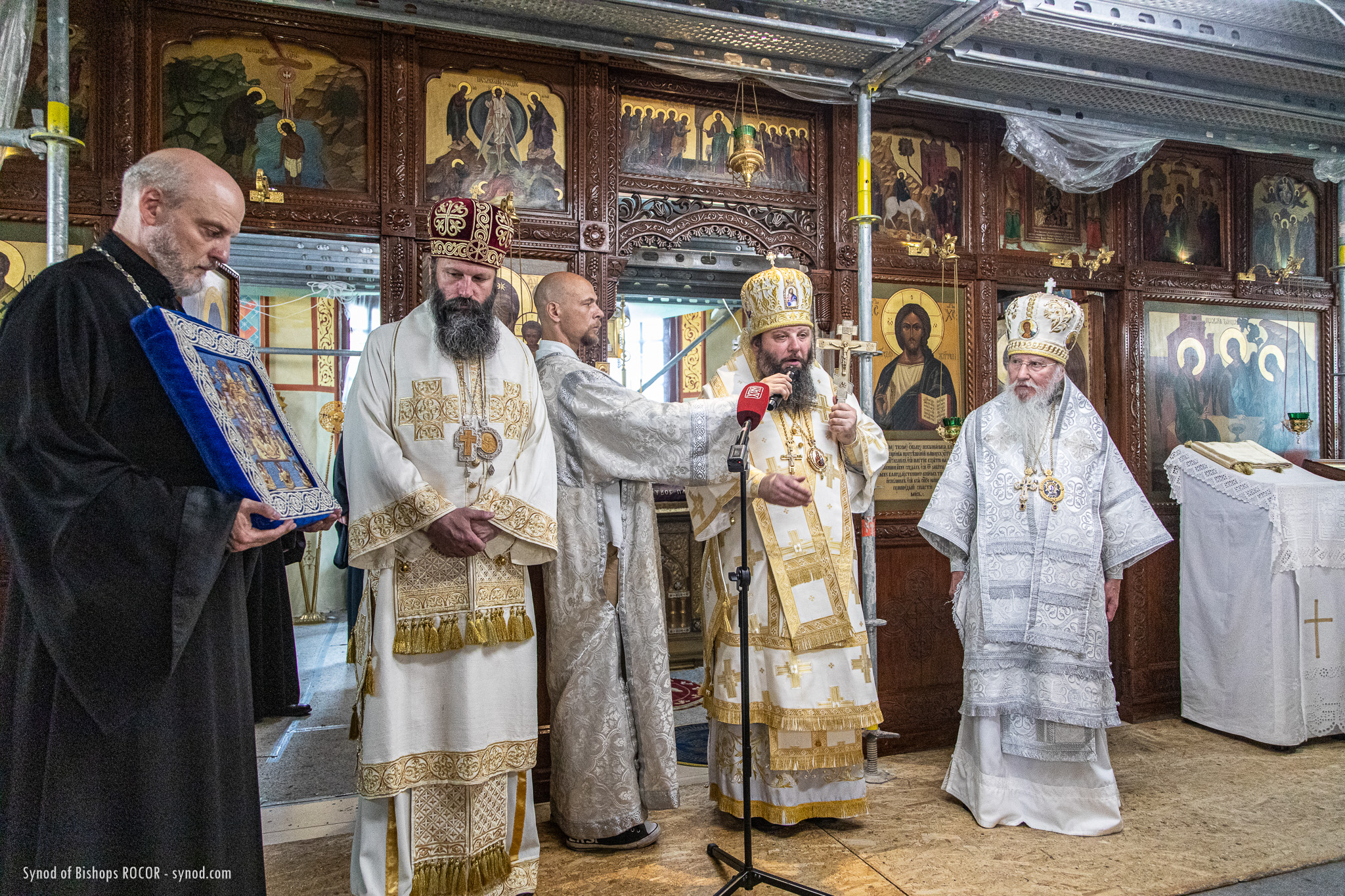 По окончании богослужения настоятель храма протоиерей Виталий Тарасьев приветствовал Первоиерарха Русской Зарубежной Церкви, выразив радость состоявшимся служением Его Высокопреосвященства в храме, где молились его предшественники: Блаженнейшие митрополиты Антоний (Храповицкий) и Анастасий (Грибановский), и преподнес ему икону Божией Матери «Дечанской». Затем митрополит Николай обратился к собравшимся со словами приветствия и назидания, вручив протоиерею Виталию Тарасьеву список с Курско-Коренной иконы Божией Матери в швейной ризе, некогда украшавшей чудотворный образ.
