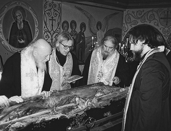 При более усердном старании отца протодиакона замок сломался. Пришлось ломами, щипцами и отвертками отделять крышку. Гроб разваливался, рассыпался на глазах у всех. Взывая о помощи Пречистой Матери Божией, запели: «Не имамы иныя помощи, не имамы иныя надежды, разве Тебе Владычице, Ты нам помози…» Наконец, после приблизительно десятиминутной работы, крышка гроба отделилась. Трудно описать словами то трепетное состояние, которое охватило всех нас.
