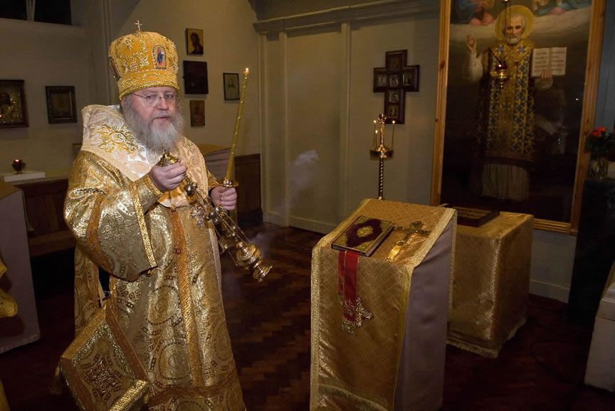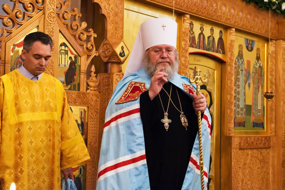 On November 14, His Eminence officiated at Divine Liturgy at Nativity of the Mother of God Cathedral in London along with His Eminence Archbishop Mark of Berlin and Germany, Administrator of the Parishes of the Russian Church Abroad in Great Britain; His Grace Bishop Elisei of Sourozh; and His Eminence Archbishop Anatoly of Kerchensk, and many local clergymen. After the end of Divine Liturgy, His Eminence consecrated the new iconostasis and panikadilo (chandelier) in the upper church. Then His Eminence gave a gramata (decree of blessing) from the President of the Synod of Bishops to SD Kondrashov "in view of his earnest labors, generosity and active participation in church life."