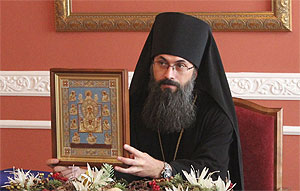 On November 11, 2013, His Grace Bishop Innokenty of Ussuriisk, Vicar of the Vladivostok Diocese of Russia, met with journalists to discuss the forthcoming visit to the Primorsk Metropoliate of the Russian Orthodox Church of the Kursk-Root Icon of the Mother of God “of the Sign” The thirteenth-century icon will arrive on November 14 at Protection Cathedral at 9:00 am. Vladyka Innokenty outlined the schedule of the visit to the cathedral cities of the Primorie region. He talked about the significance of this holy item: