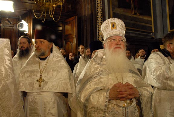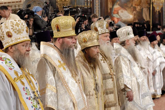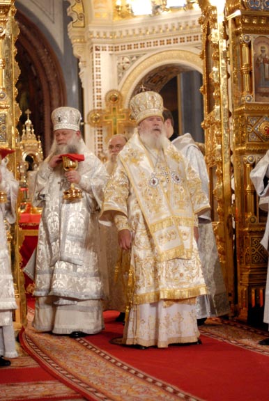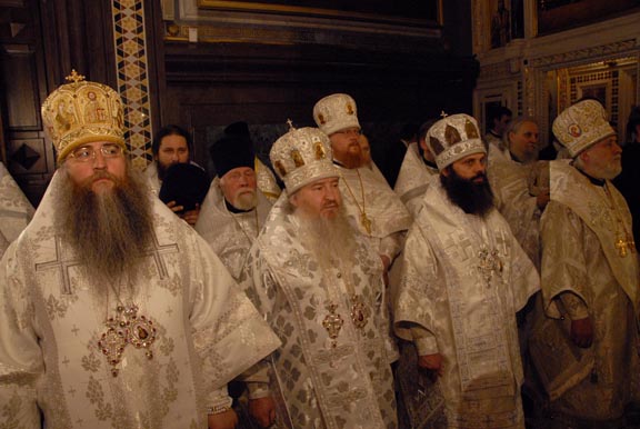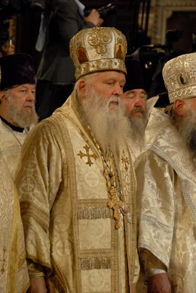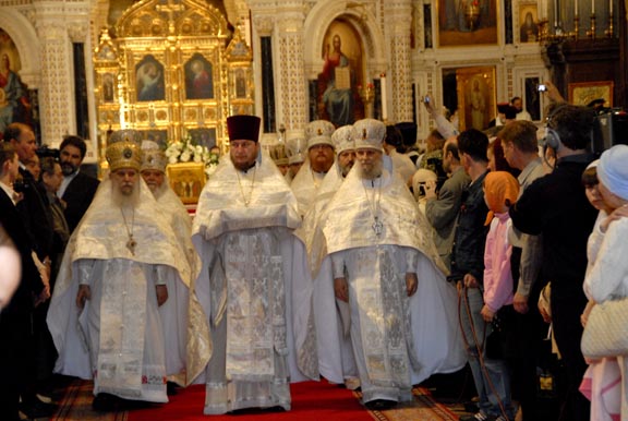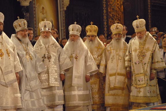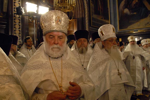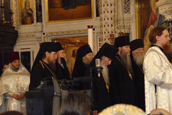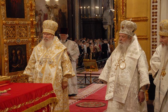 Greeting His Holiness Patriarch Alexy II of Moscow and All Russia were the archpastors of the Russian Orthodox Church Outside of Russia and members of the Holy Synod of the Moscow Patriarchate, plus Archbishop Innokenty of Korsun and Archbishop Evgeny of Verey, members of the Moscow Patriarchate's Commission, who all emerged together through the Royal Doors wearing white vestments.