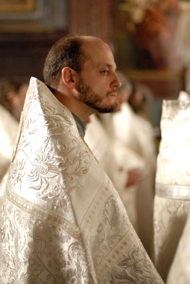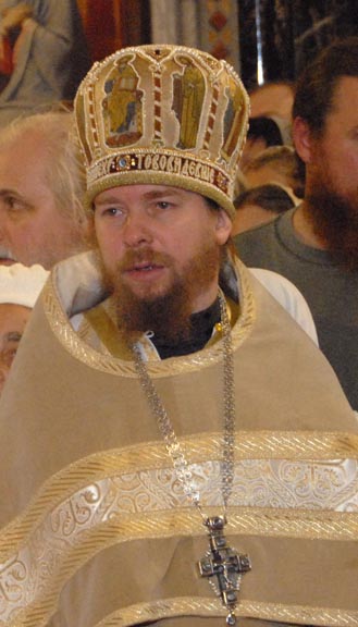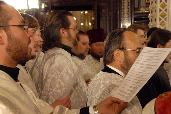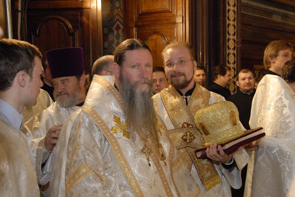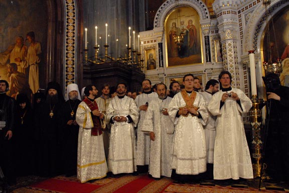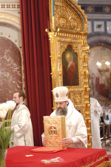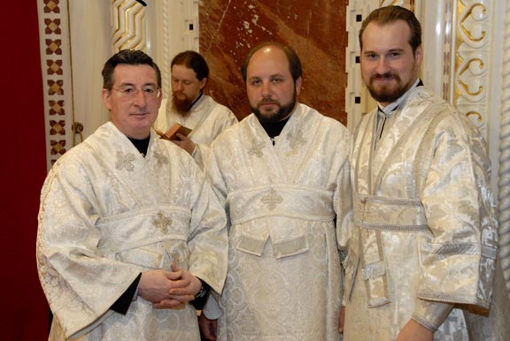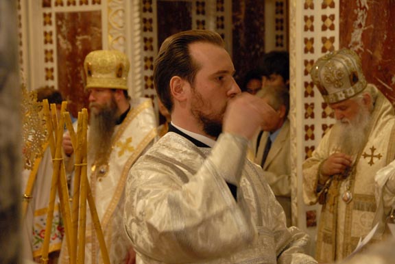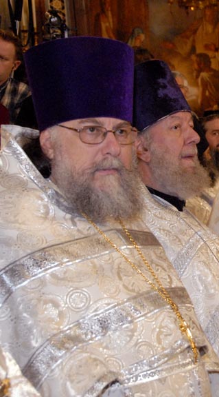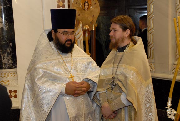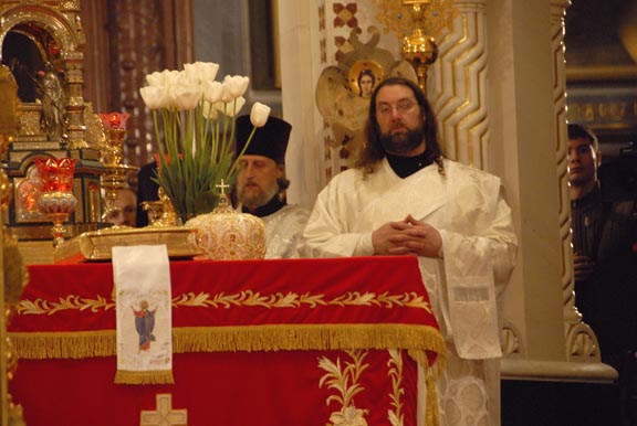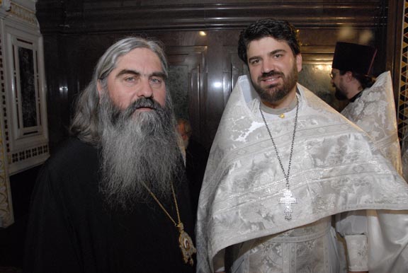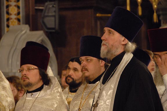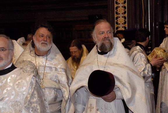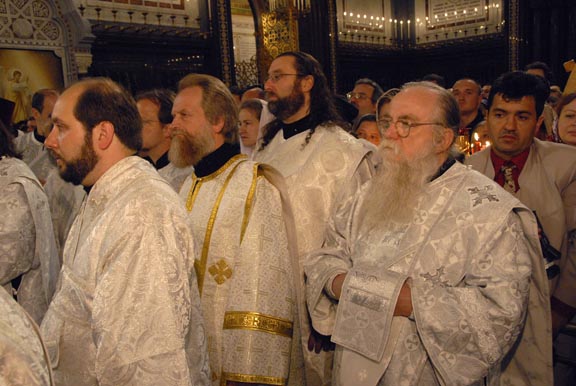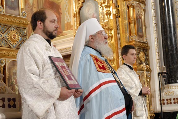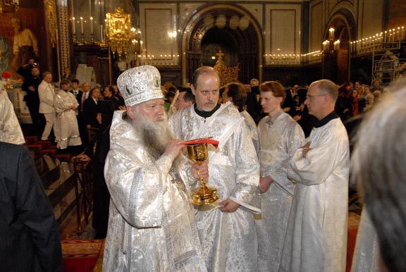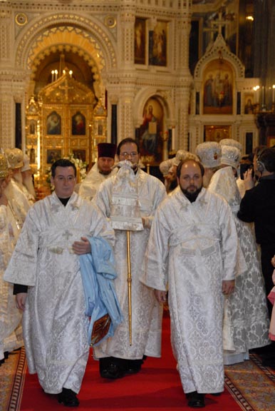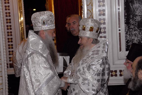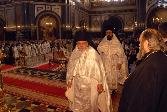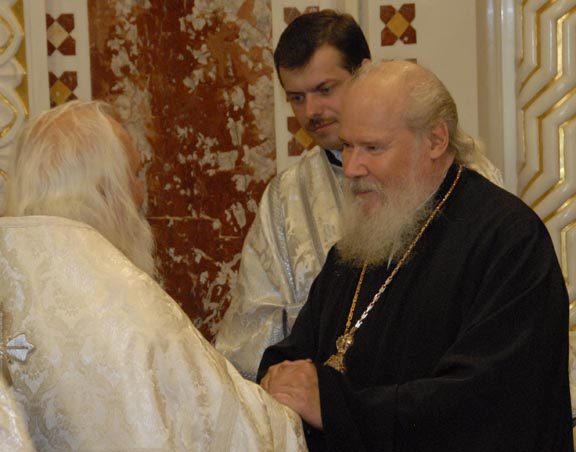 During the proskomedia, the First Hierarch of the Church Abroad arrived. His Eminence was greeted by the Secretary of the Commission of the Russian Orthodox Church Outside of Russia on talks with the Moscow Patriarchate, Protopriest Alexander Lebedeff, and the Secretary of the Commission of the Moscow Patriarchate on talks with the Church Abroad, Protopriest Nikolai Balashov. Clergymen of the Moscow Patriarchate emerged from one of the side altar doors to greet His Eminence, and an equal number of clergymen of the Russian Orthodox Church Outside of Russia from the other side. Venerating the altar-table cross, His Eminence Metropolitan Laurus blessed the clerics and worshipers with it, and then entered the altar.
