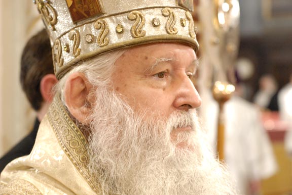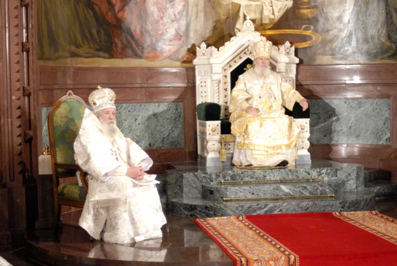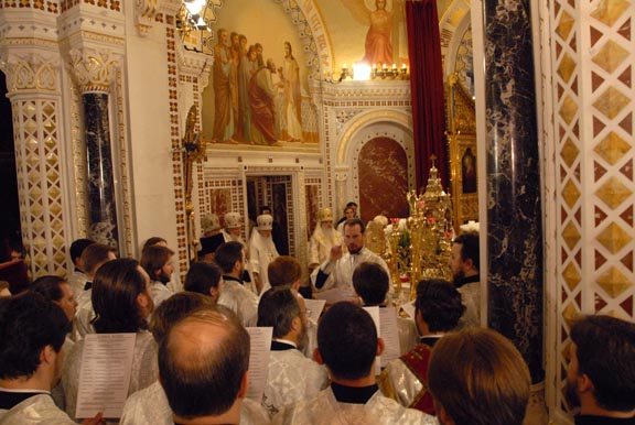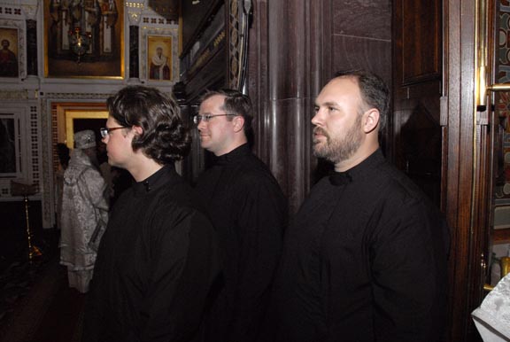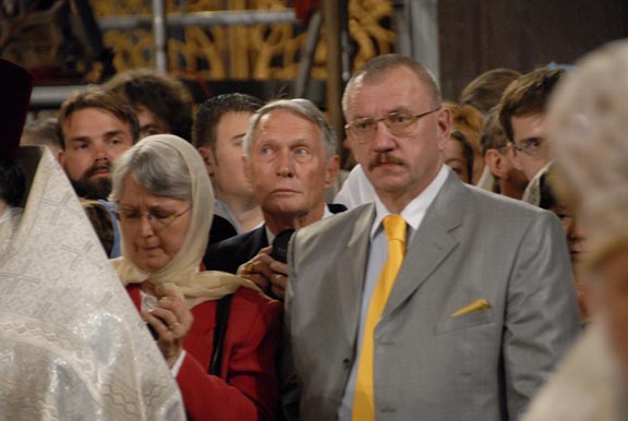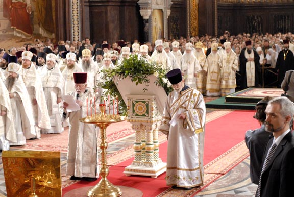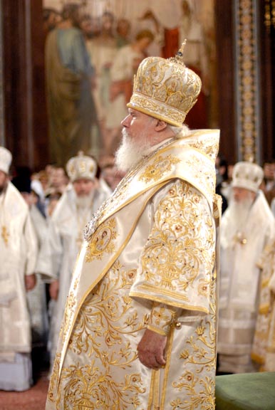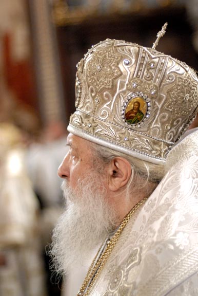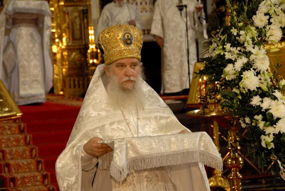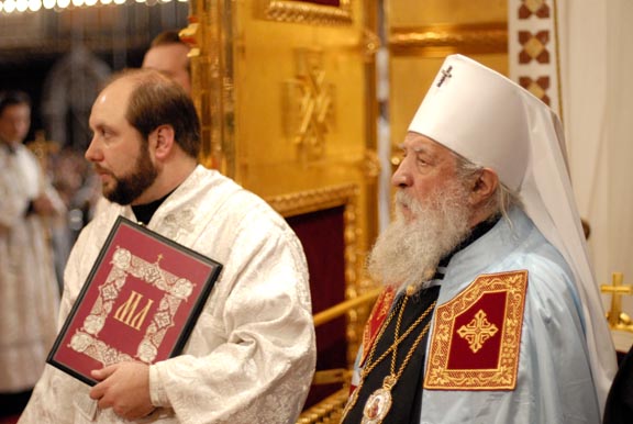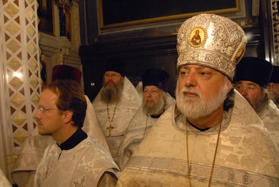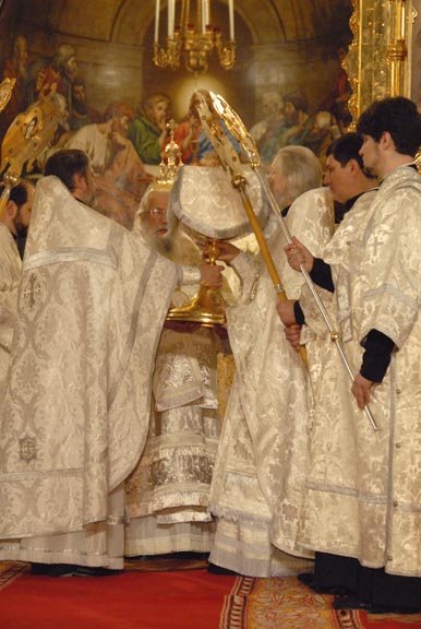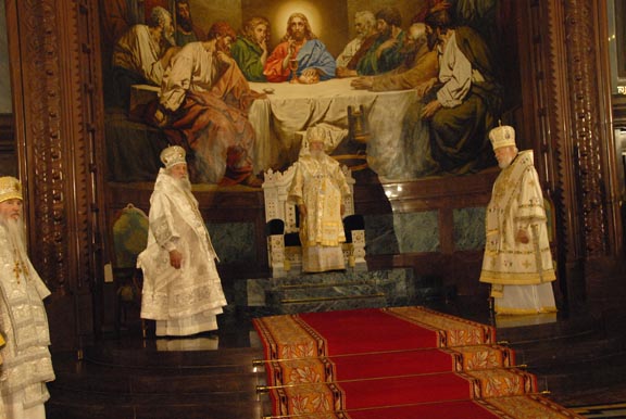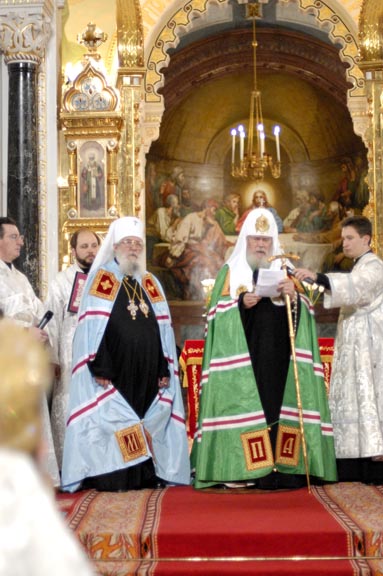 Donning the mantle, His Holiness blessed the bishops and clergymen with the cross, after which he ascended the cathedra in the middle of the church. As His Holiness Patriarch Alexy II entered the church, His Eminence Metropolitan Laurus of Eastern America and New York proceeded to the cathedra. Standing on the north and south sides were the bishops and clergymen of the Russian Orthodox Church Outside of Russia and the Moscow Patriarchate.