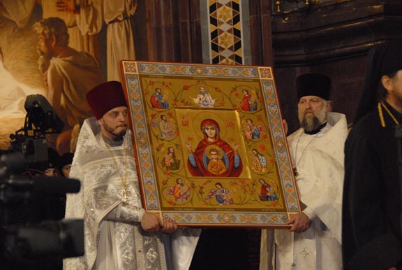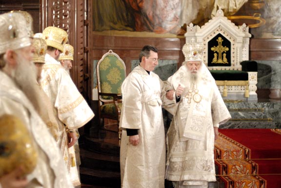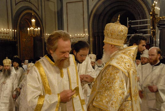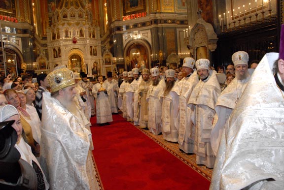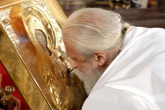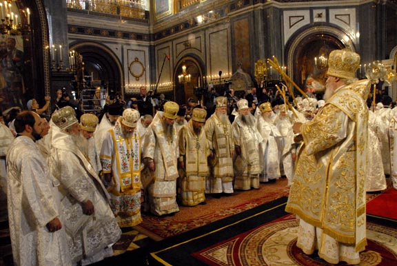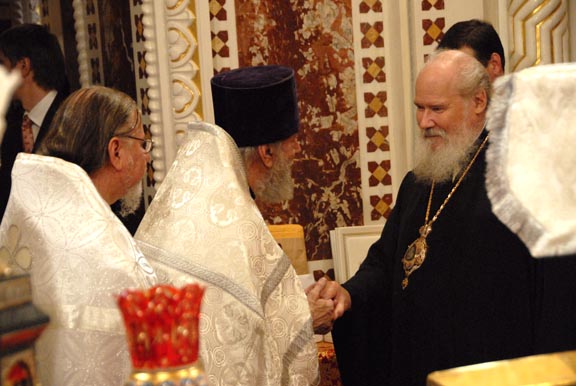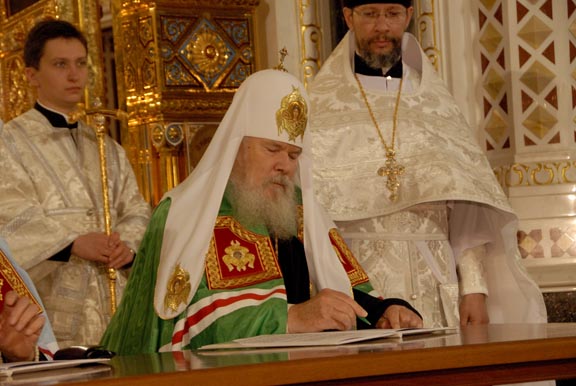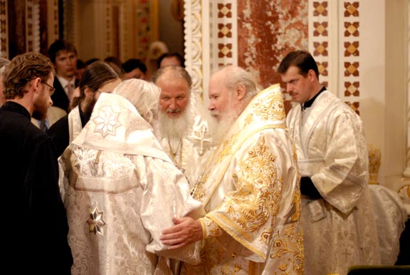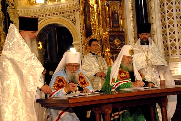 The Act was then signed on the ambo of Christ the Savior Cathedral. His Holiness Patriarch Alexy II of Moscow and All Russia and His Eminence Metropolitan Laurus of Eastern America and New York put their signatures under this historic document. Then, with the words “Christ is among us! Now and forever,” they kissed each other three times.