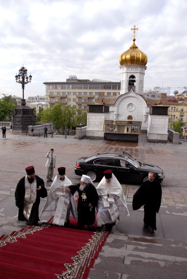 As the bells of Christ the Savior Cathedral pealed overhead, His Holiness was greeted by the Dean of the Central Deanery of Moscow, Protopriest Vladimir Divakov, and Senior Priest of Christ the Savior Cathedral, Protopriest Mikhail Ryazantsev.
