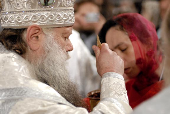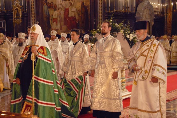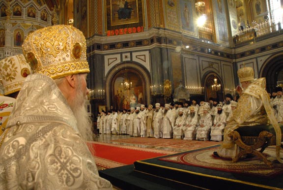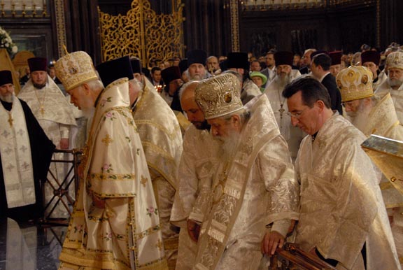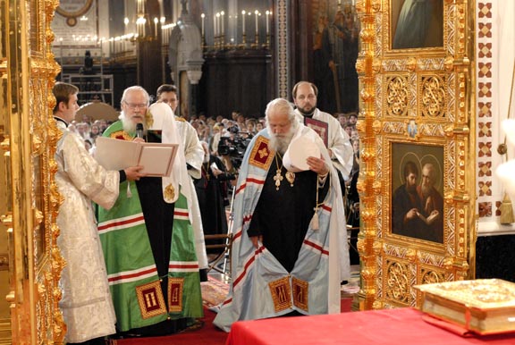 After the troparions, sung in turn by the unified choir of the Russian Orthodox Church Outside of Russia and by Holy Trinity-St Sergius Lavra Choir, His Holiness Patriarch Alexy II of Moscow and All Russia read a special prayer which included the words: “As Thee lifted Thy prayers to Thy Heavenly Father for Thy disciples, that they all be as one, gaze now with Thy merciful eyes upon Thy people, who have sinned and disobeyed Thy will, bless now our good intention and the unification of the Church to Your Glory, create this Thyself, dampen all church temptations and divisions. Having given to us Thy law to love Thee, our God, and our neighbor, deliver us from all insult and disruption, may brotherly love reign among the children of our Church, in the Fatherland and in the diaspora. Grant that we may now enter Thy temple and bring Thy bloodless sacrifice, that we may be unified in one body through communion with Thy Life-creating Body and Thy Honorable Blood and bring praise with all our hearts to Thy ineffable love for mankind.”