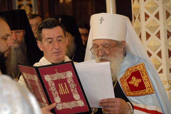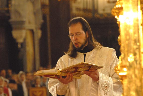 Then, the Secretaries of both Church Commissions, Mitred Protopriest Alexander Lebedeff and Protopriest Nikolai Balashov read the texts of the decrees of the Holy Synod of the Moscow Patriarchate and of the Synod of Bishops of the Russian Orthodox Church Outside of Russia on the confirmation of the Act of Canonical Communion. The text of the Act itself was read from the ambo by Protodeacon Vladimir Nazarkin.